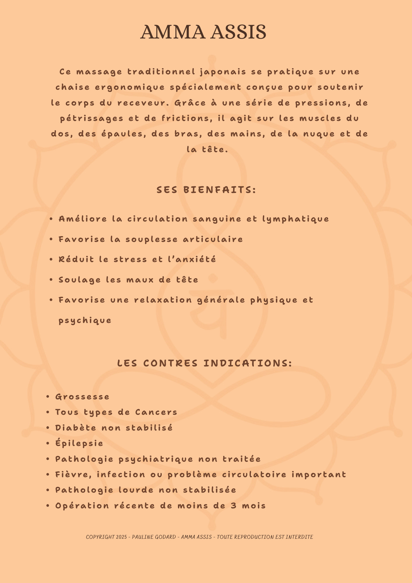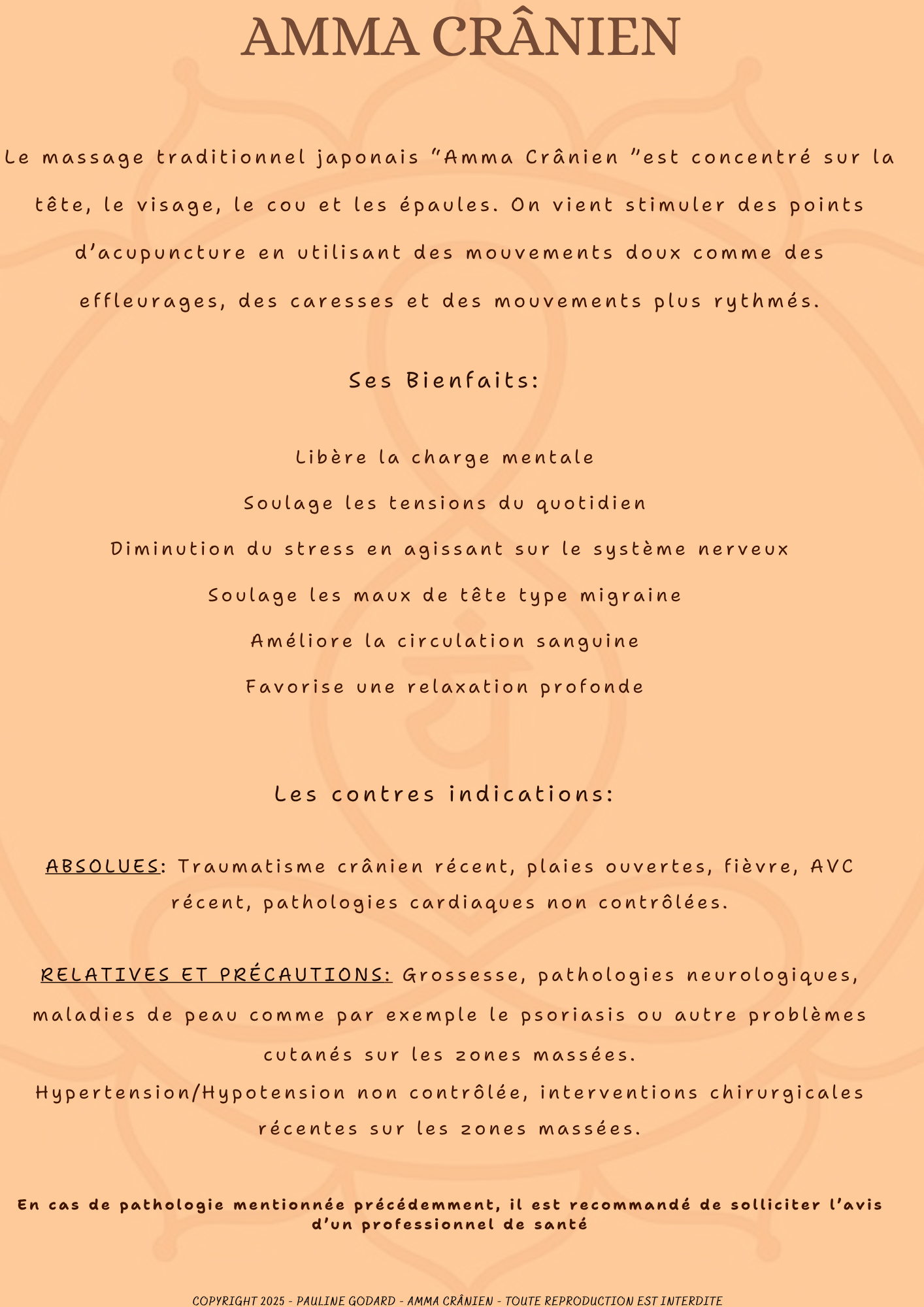 "J’ai testé le soin Amma crânien et… wow. C’était juste incroyable. Dès les premières minutes, j’ai senti une détente profonde s’installer. Toutes les tensions accumulées dans ma tête, ma nuque, mes épaules… se sont littéralement envolées. C’est comme si Pauline avait appuyé sur « pause » dans mon mental, et elle m’a offert un vrai moment de légèreté. À la fin de la séance, je me suis senti(e) à la fois apaisée, libérée et rechargée. Une vraie bulle de bien-être que je recommande à 100%. Merci pour ce moment précieux 🙏✨"