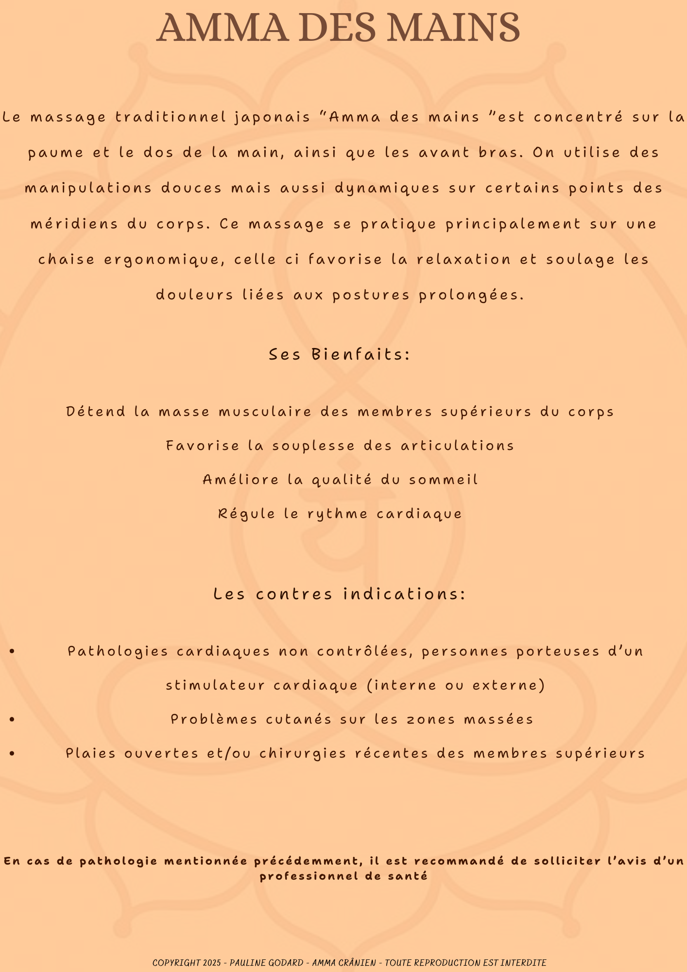 Le massage AMMA, parfois écrit anma, est une technique traditionnelle japonaise dont le terme signifie "calmer par le toucher". Il puise ses racines dans le terme chinois « Anmo », une méthode de soin ancestrale transmise depuis des millénaires. Après un passage par la Corée, le Amma s’est implanté au Japon il y a près de 1 300 ans, où il s’est peu à peu développé pour devenir un véritable art du toucher.