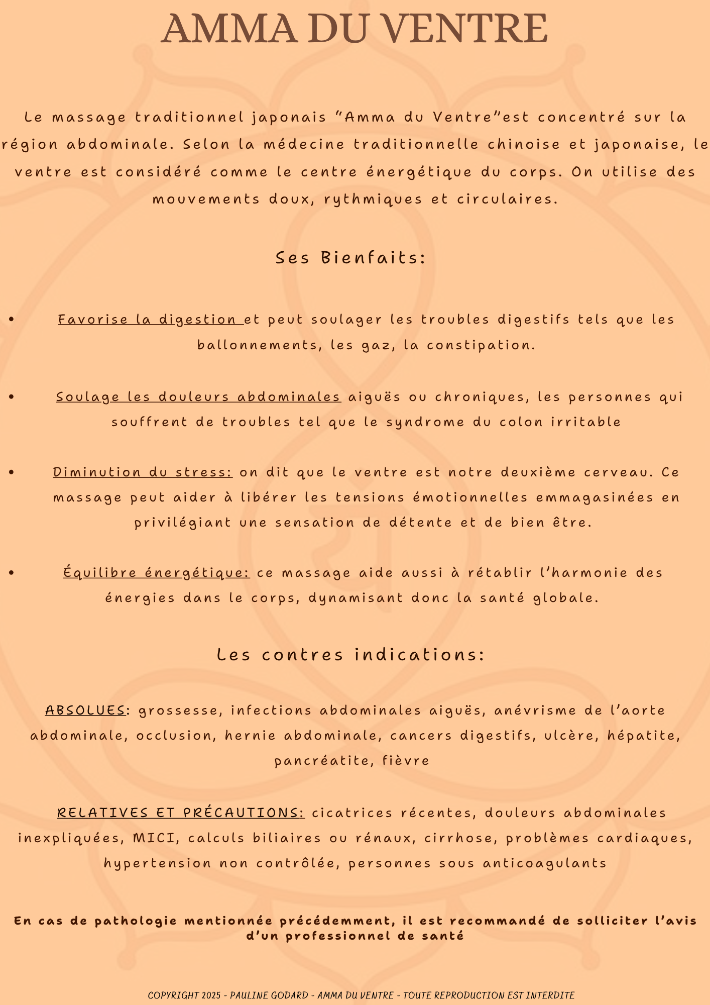 "J’ai eu le plaisir de recevoir aujourd’hui un soin Amma du Ventre ! Je suis dans une période anxieuse, Pauline a su avec sa douceur et son écoute me dénouer de mes tentations et m’apporter des conseils spécifiques à ma situation. Merci beaucoup et à très vite pour un nouveau soin ✨"